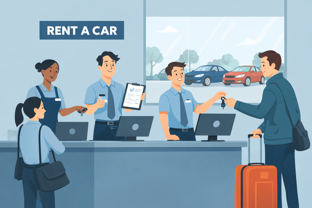 Normalmente pedem: carta de condução válida, passaporte/ID, e um cartão (ou o método de pagamento em teu nome), além da confirmação da reserva.